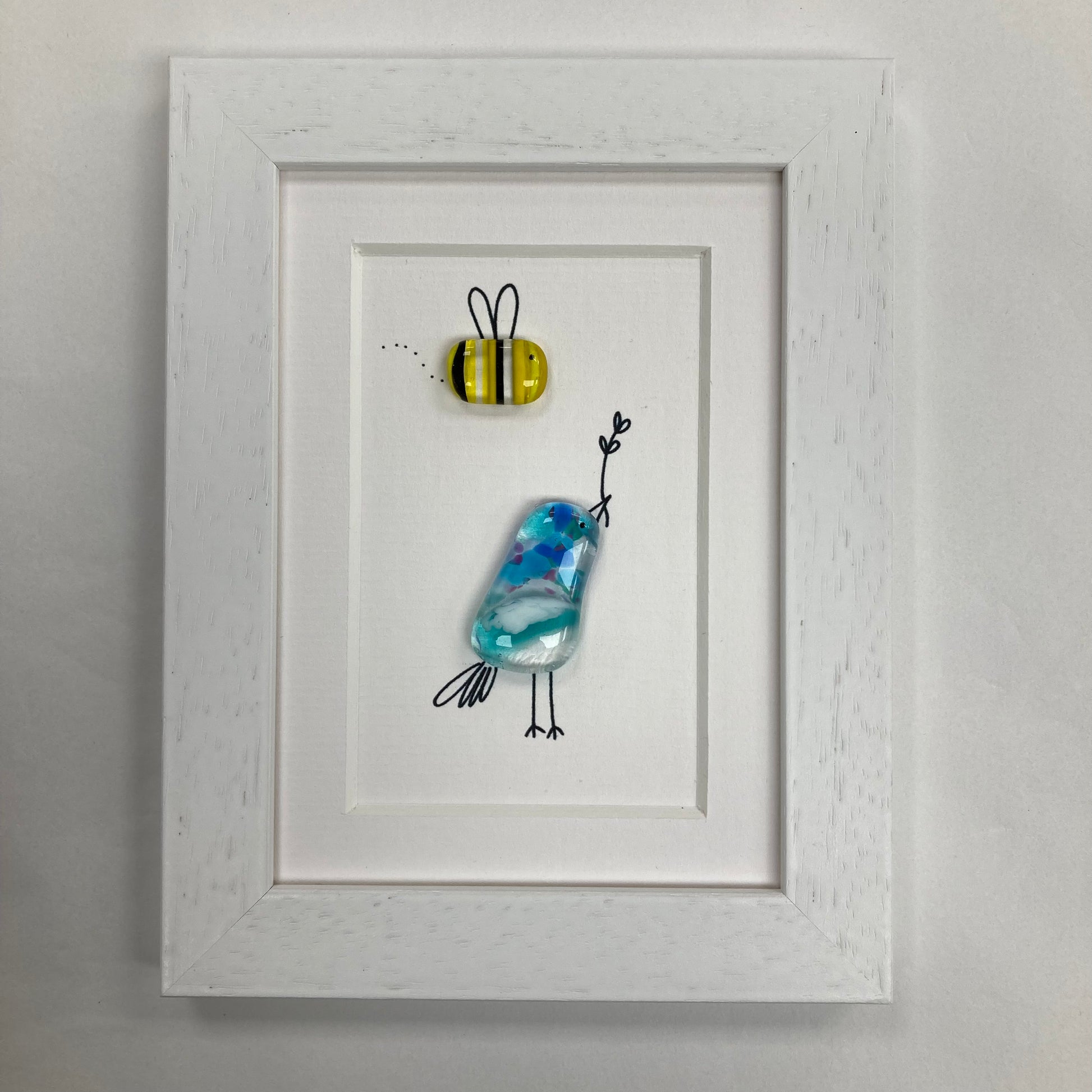 This fun artwork of a bird and bee combines hand-drawn illustrations and tactile, rounded fused glass nuggets. Each nugget, with its own individual markings combined with a blend of coloured glass, has been fired twice at over 800 °C making each one a little work of art in itself!