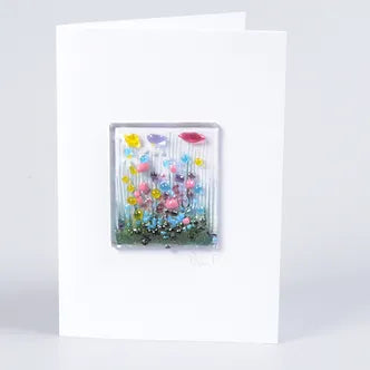 Pam Peters: Fused Glass Blank Cards are the perfect solution for those seeking an extraordinary and artistic way to express their heartfelt messages. Each card features a small piece of fused glass, hand-painted and fused at 800°C, creating a unique miniature artwork that adds a captivating touch to your greetings. These cards are more than just stationery; they're keepsakes designed to be treasured or even framed.