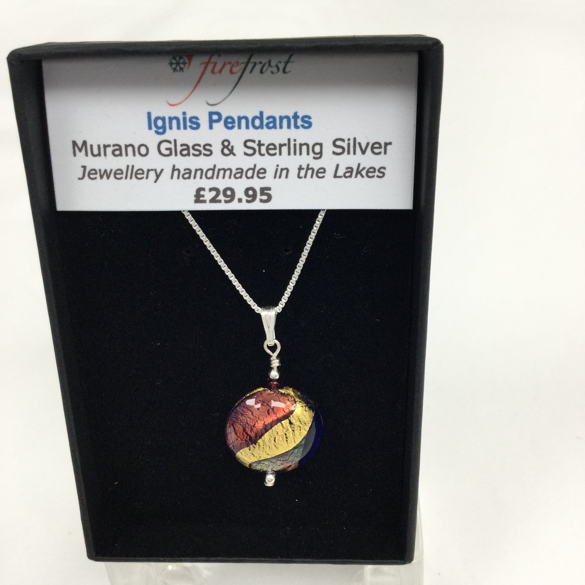 This Ignis pendant comprising red,blue and gold is the perfect accessory to your outfit. Handcrafted using 3 colours of Murano glass giving the impression of fire.