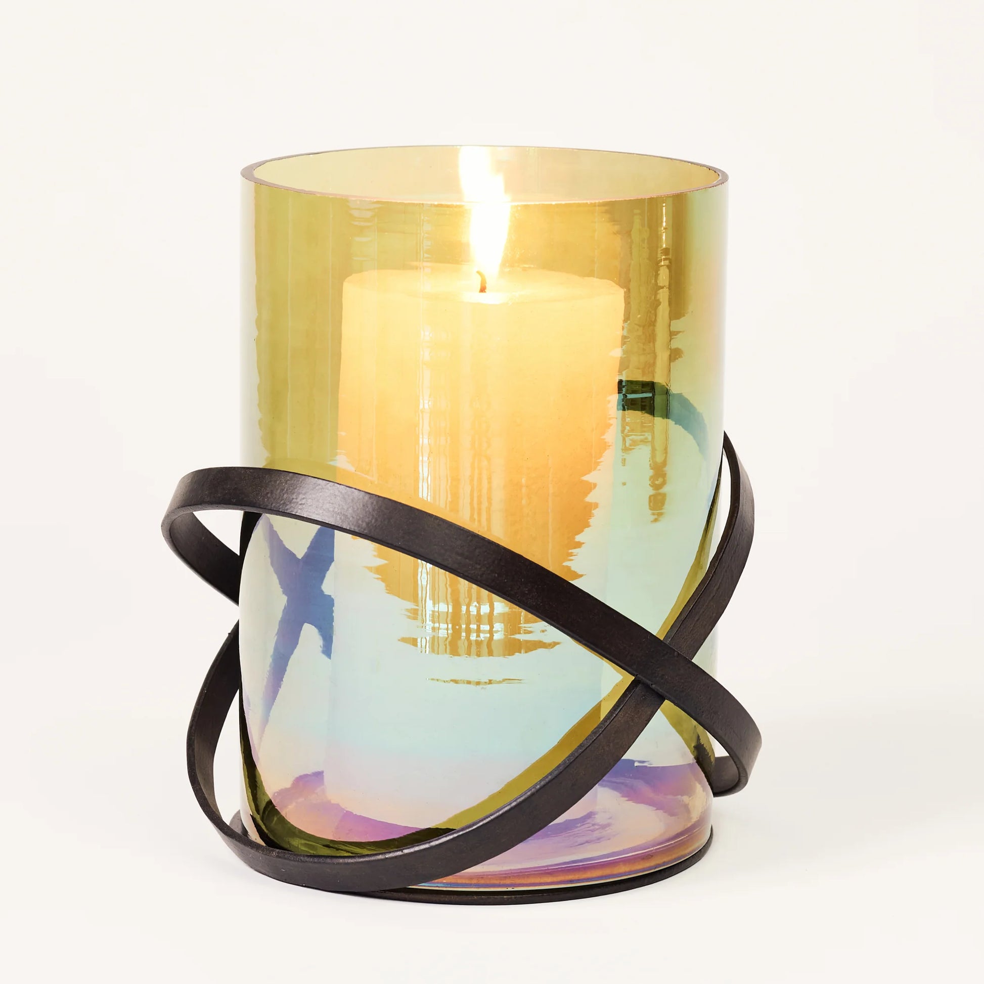 This stunning 'Emerald Green Light' range features mouth-blown glass vases and hurricanes with the most striking, iridescent finish. Dual tone green and rainbow lustre paints are hand-sprayed onto each piece to achieve that glossy finish. Shiny hues of green, pops of pink and calming turquoise reflect beautifully as you move around the piece.