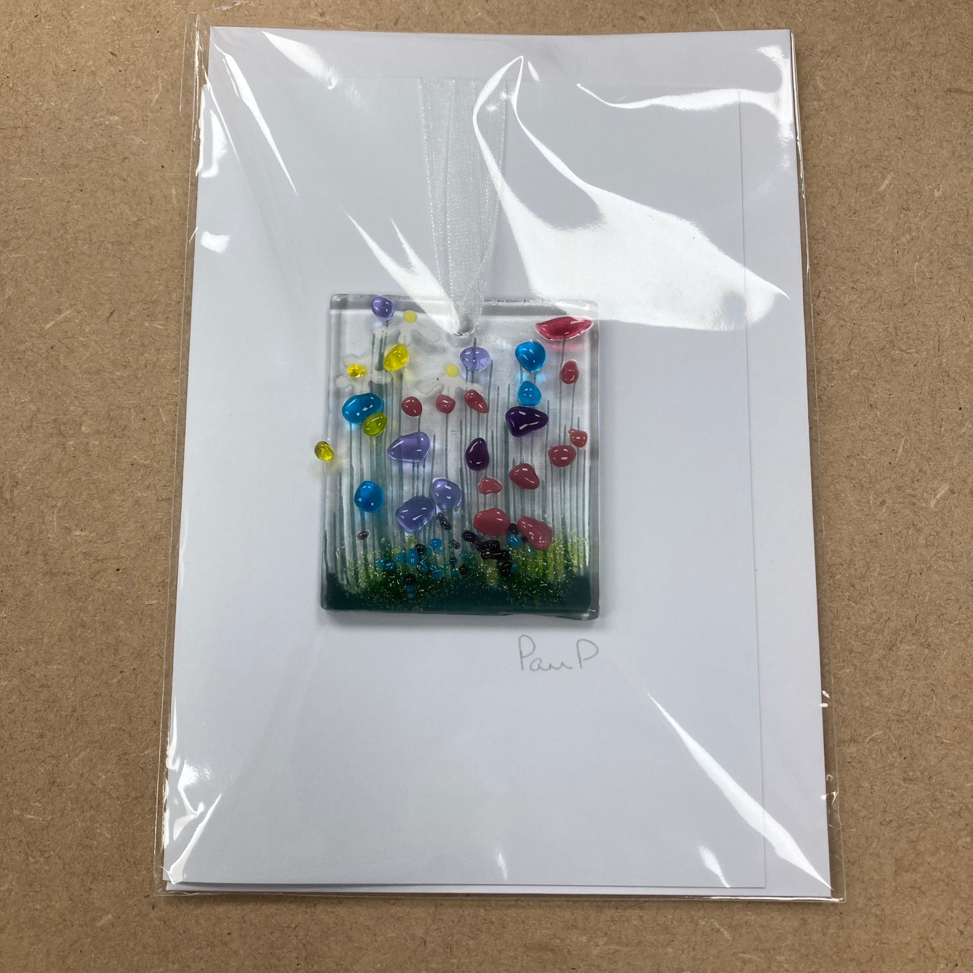 This piece of glass artwork has a ribbon attached so that you can take it off the card and hang it in your home.