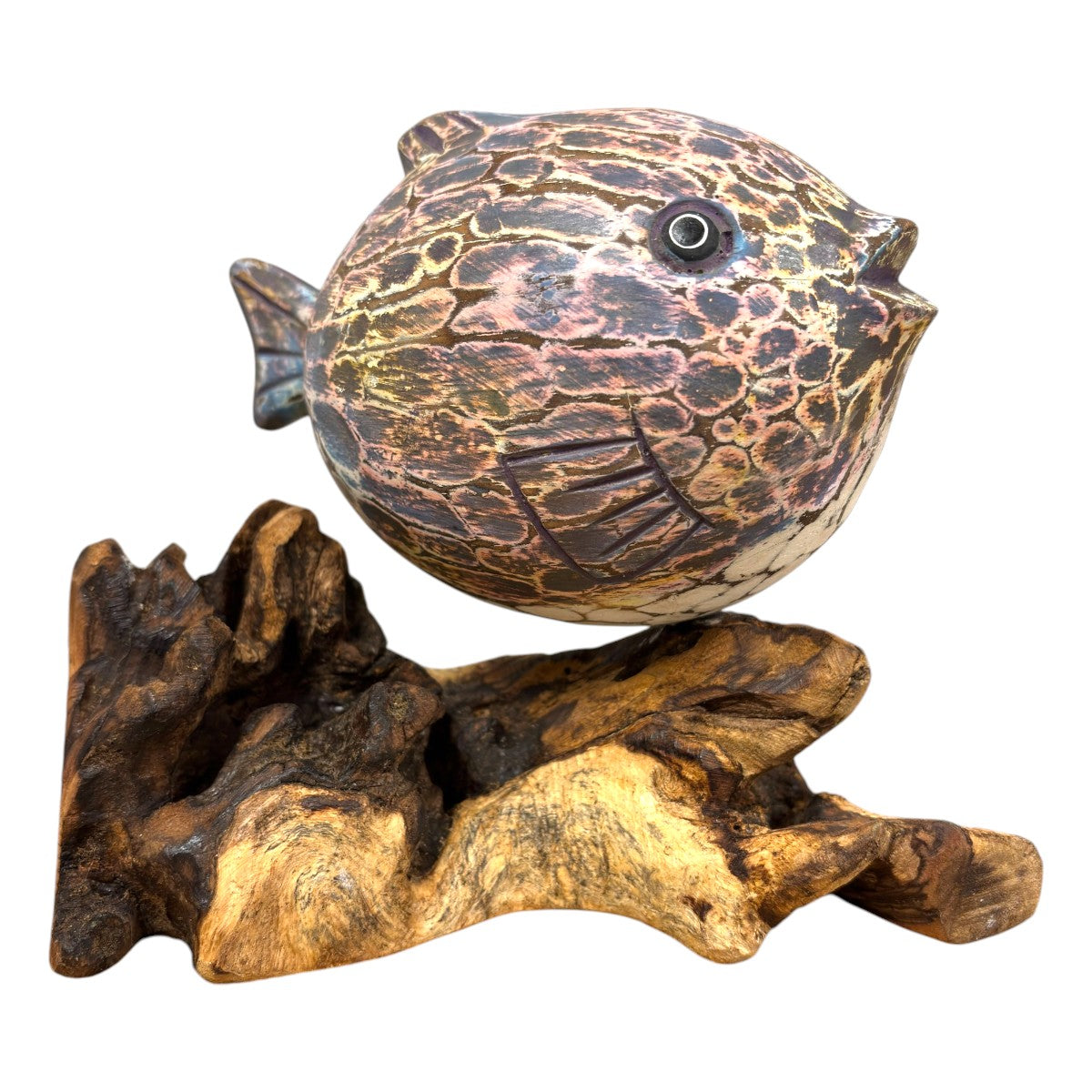 Hand-carved and hand-painted albesia wood puffer fish on stand.
