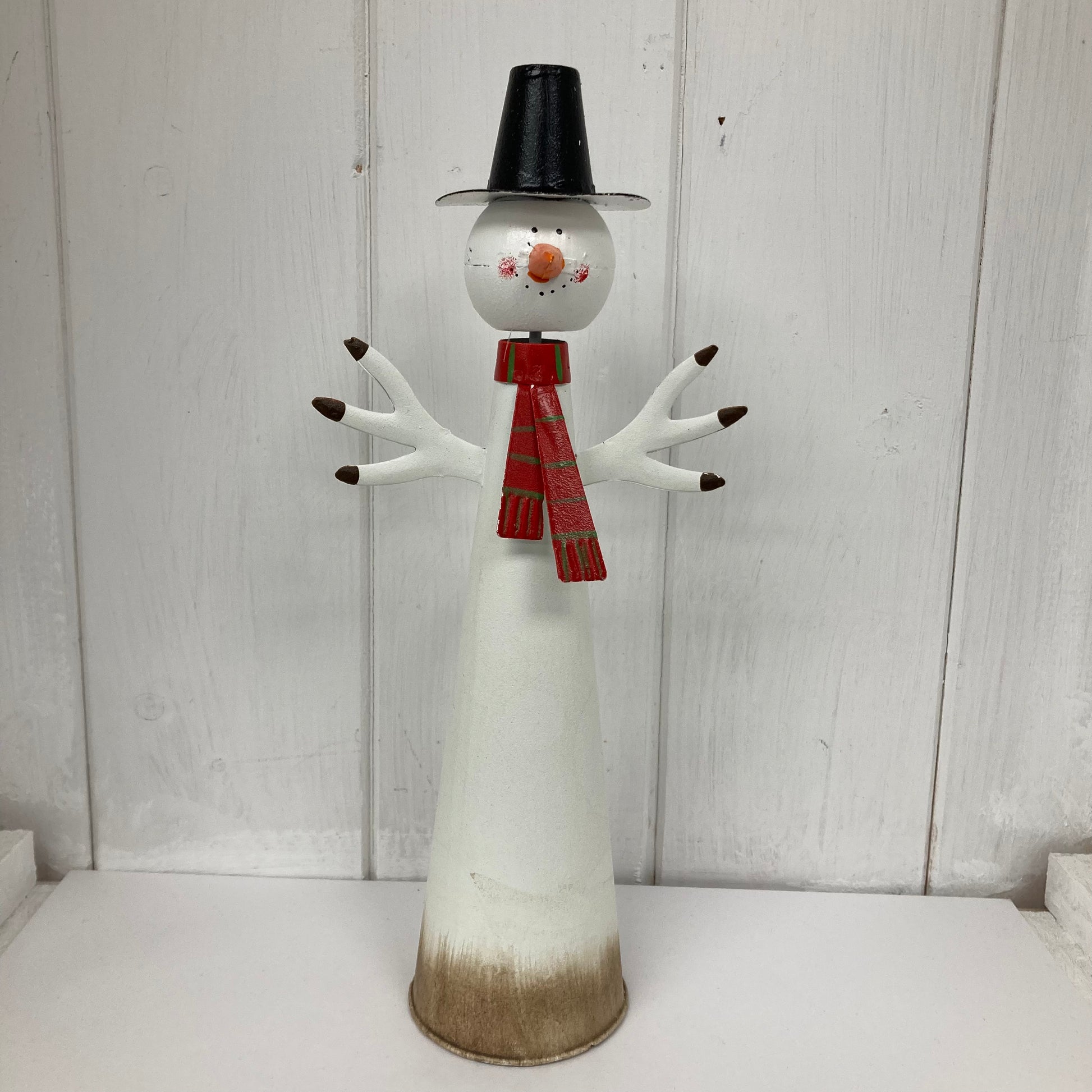 A cone shaped metal snowman with a black hat and carrot nose.