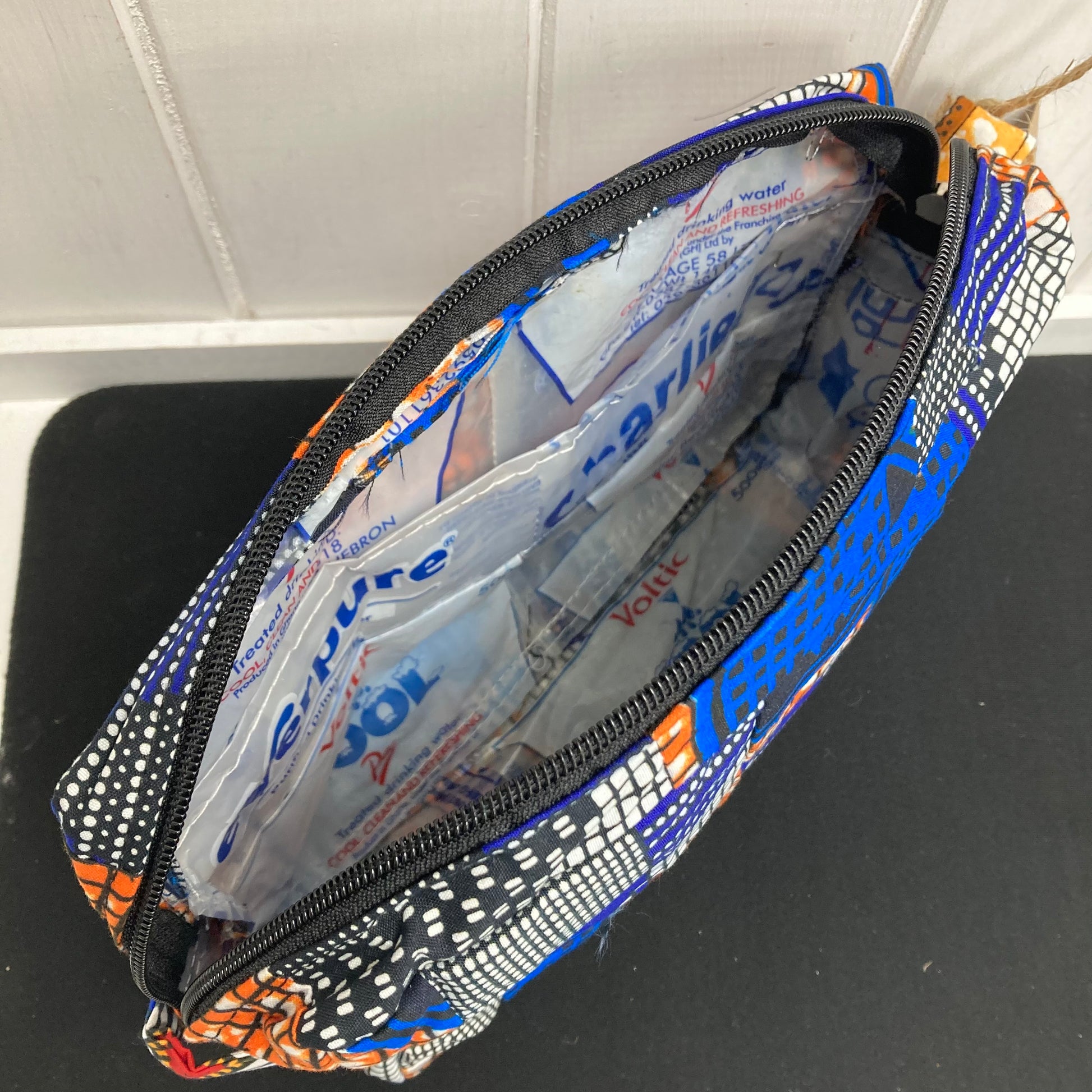 These wash bags are made from up cycled water bags and off cuts of fabric from Ghana. They have a pocket inside and a loop on the outside for hanging. Great for travelling as very light.