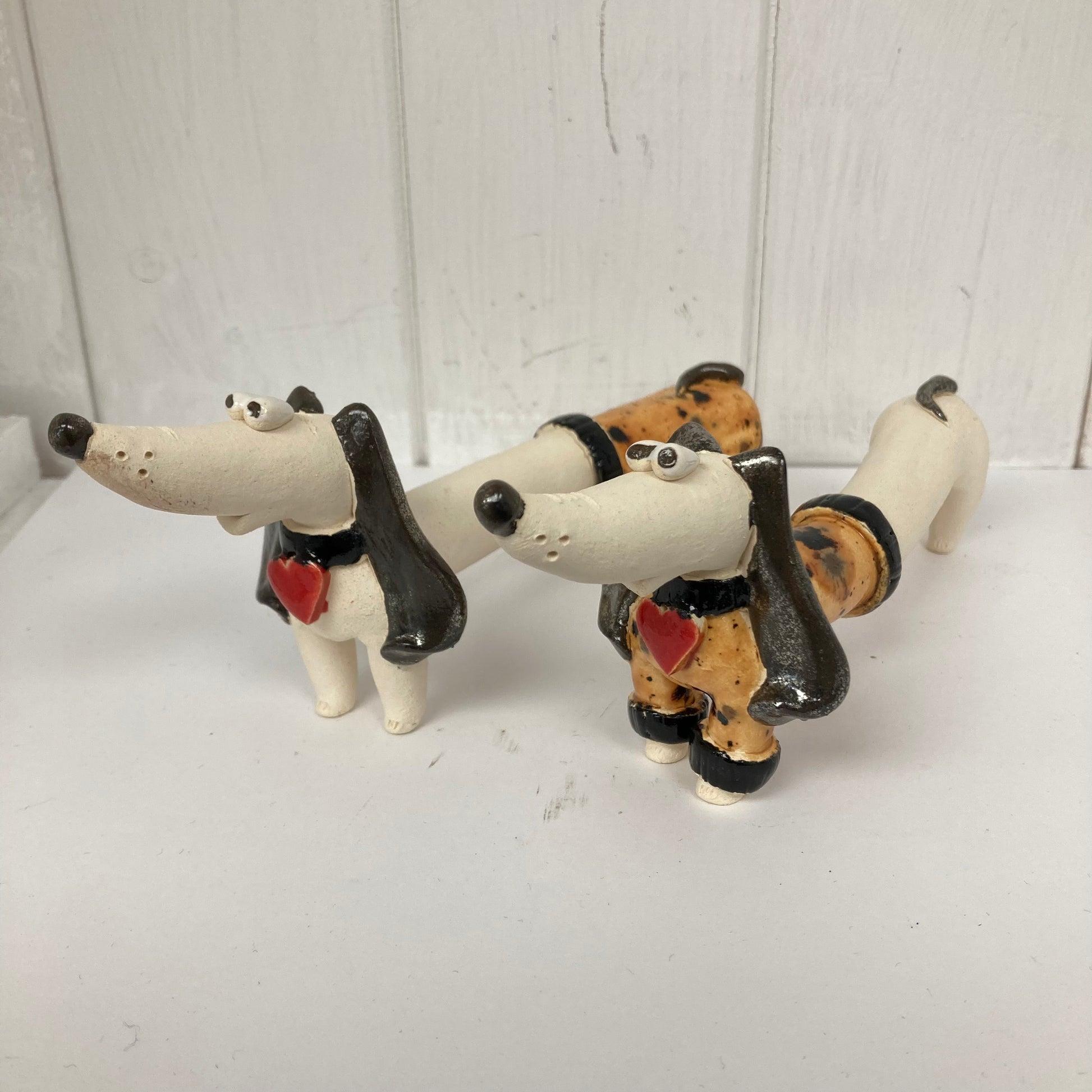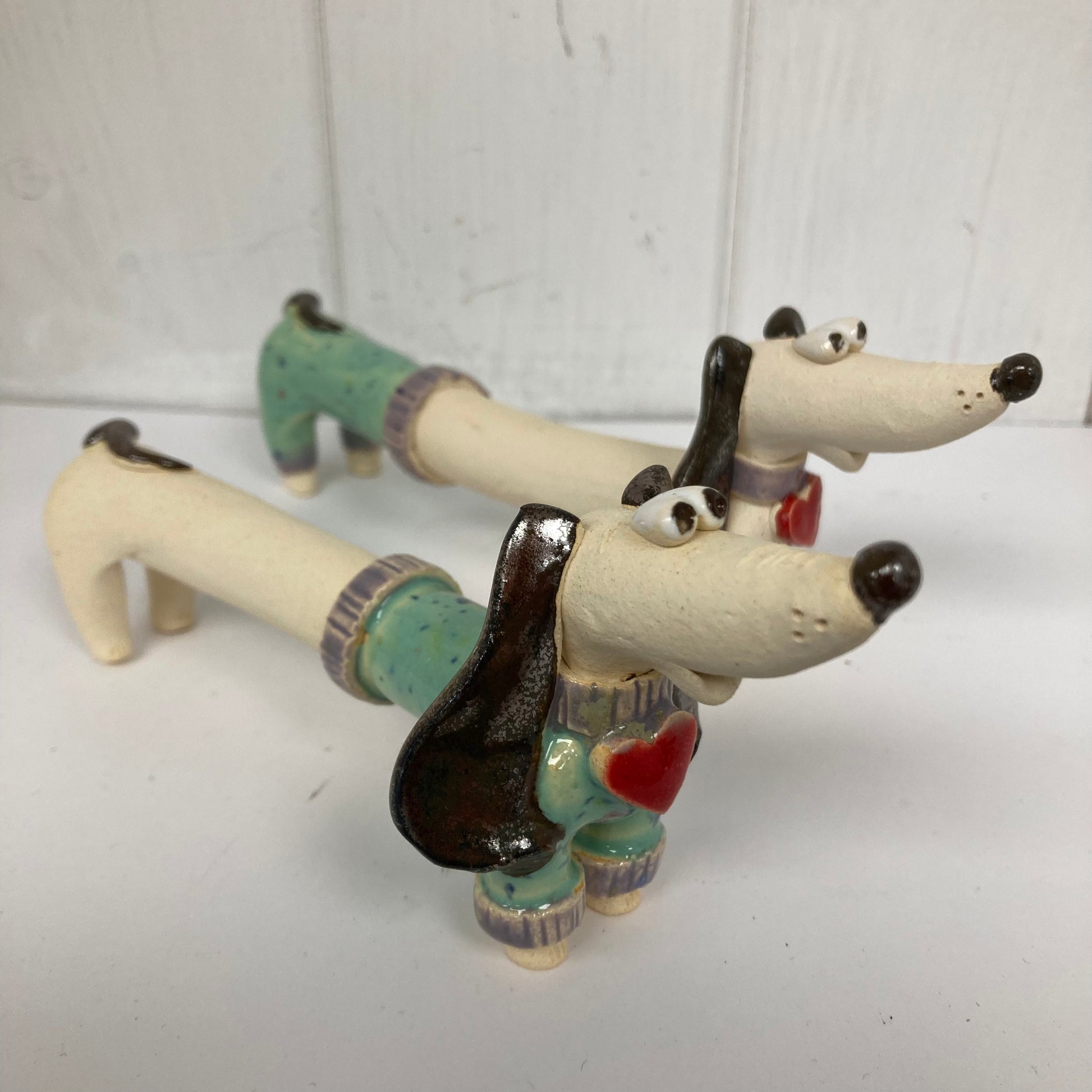 A pair of dachshunds that compliment each other. Can be bought individually or as a pair.